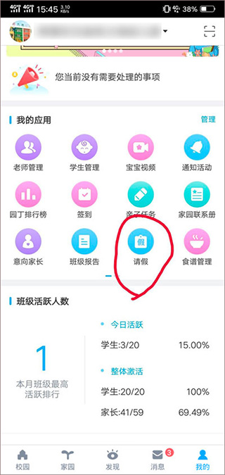 1、打开掌通家园,在登录自己的账号之后,在【校园】页面找到并点击【请假】按钮;