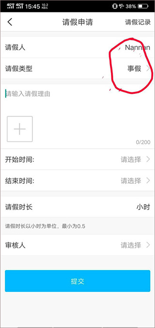 3、选择请假人、请假类型(事假、病假等等)、请假理由、开始时间、结束时间等等,点击【提交】;