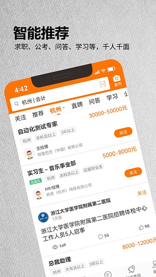 2、智能推荐:智能职位推荐算法,1分钟完成微简历,主动匹配目标薪资职位机会,发送邀请让你选择。