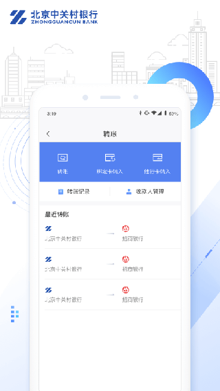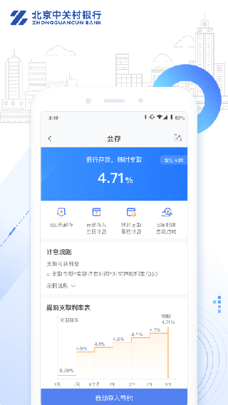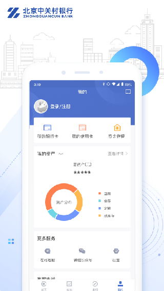 中关村银行APP是我行为客户提供的一站式互联网金融服务平台。目前客户可在线开立电子账户,实时转入、转出资金,还信用卡,存款至就享存,查询资金存管账户信息(仅限我行合作平台)。我行会在后续版本中提供理财规划、投资理财、综合保险、信用贷款等产品,不断完善APP的金融服务体系。