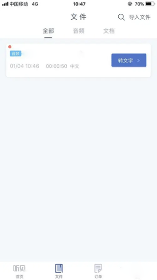 3、外部音频转文字,已有录音文件,可在文件列表页右上角“导入文件”,选择手机中已有的文件,导入进行转写。(机器文档翻译,操作方法一致)