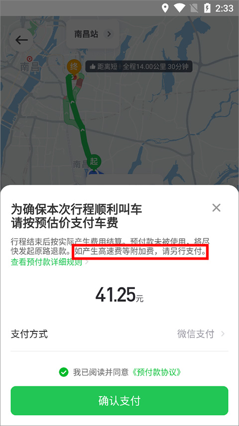 下图是支付页面的截图,下图中的红色方框内的文本信息可以说明高速费用应该由乘客自己承担