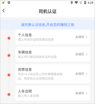 3、司机认证是需要填写个人信息、车辆信息、资质信息以及人车合照。