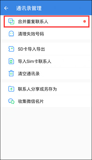 请在右下角【我的】菜单中,找到【通讯录管理】选项,其中就有“合并重复联系人”功能,点击进入后,按照指引操作即可。