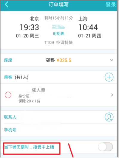 7、选择要购买的车次后,注意,若是开启当无下铺票或靠窗票时,接受其它随机的票。则有可能买到不是下铺或靠窗的票。