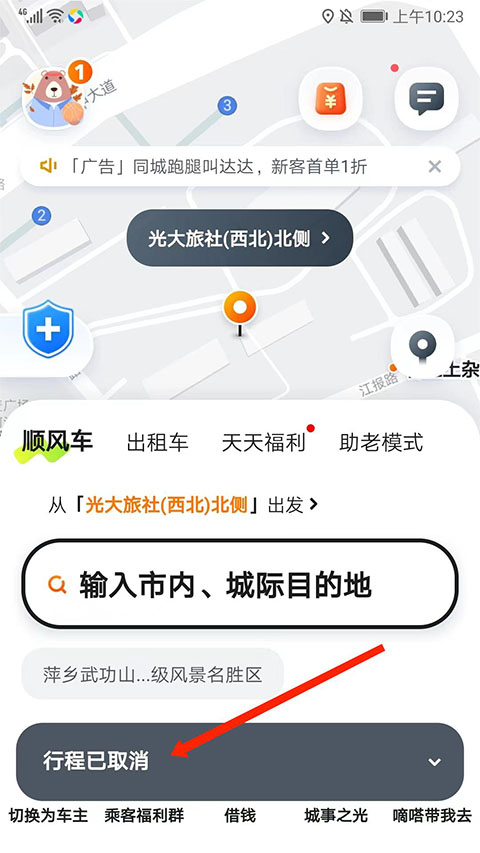 5、返回嘀嗒出行主界面,显示“行程已取消”,至此订单行程成功取消。