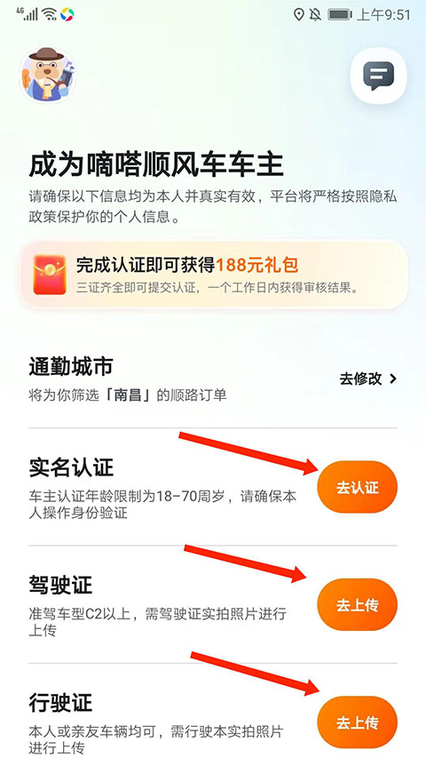 4、进入到认证界面,依次进行“实名认证”、上传“驾驶证”,上传“行驶证”的操作,完成后进行提交,