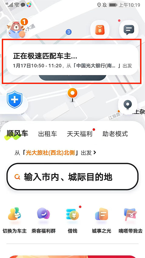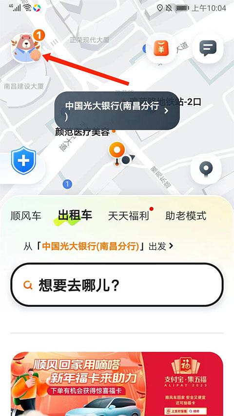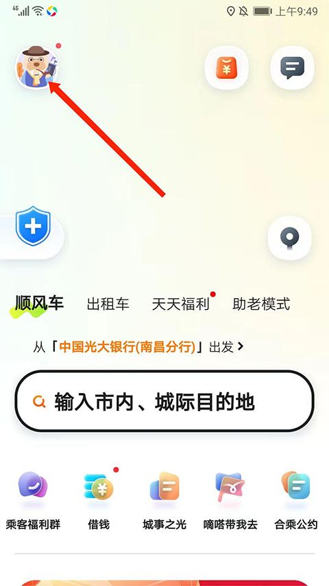 1、打开嘀嗒出行app,进入主界面,可看到有“顺风车”、“出租车”、“天天福利”和“助老模式”等选项,选择右上角“头像”图标,