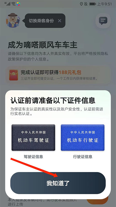 3、进入加入嘀嗒出行顺风车车主界面,系统会提示认证所需材料,选择“我知道了”选项,