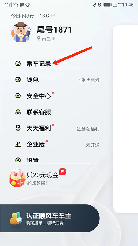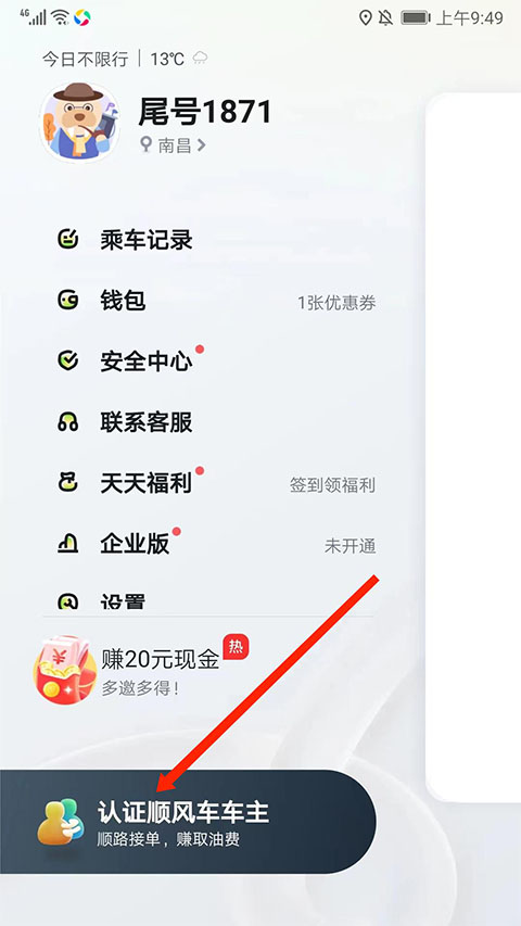 2、进入用户中心界面,选择下方“认证顺风车车主”选项,