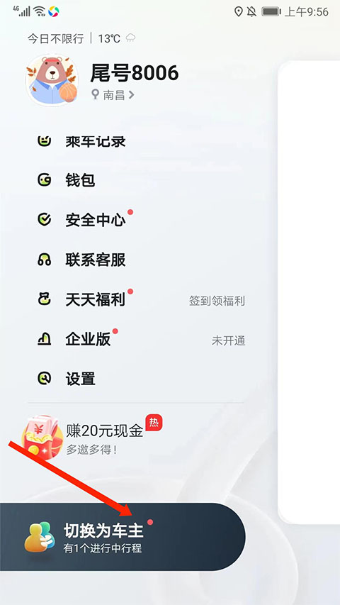 5、回到用户中心界面,在下方看到“切换为车主”,车主已经注册成功。