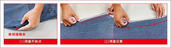 (2)自裤裆接缝处开始沿着裤管边缘,一直量到裤脚为止,即为裤内裆长(内裆长),测量方式与牛仔裤注意事项相同。