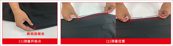 ②扣上裤子纽扣并拉上拉链,将腰部两侧上端对准,用手顺着裤子将其对折(需稍微用力将裤子拉平),平铺放置,开始测量裤内裆长(内裆长)。